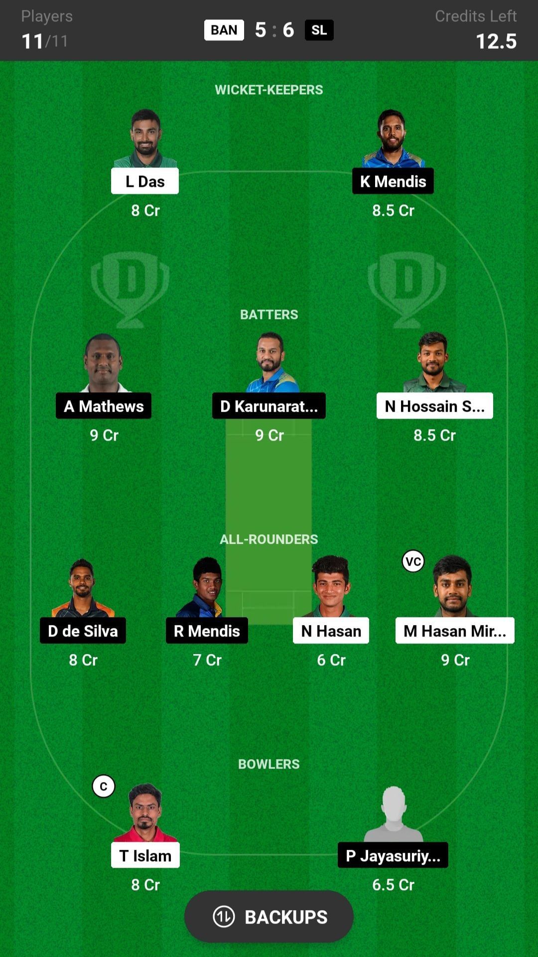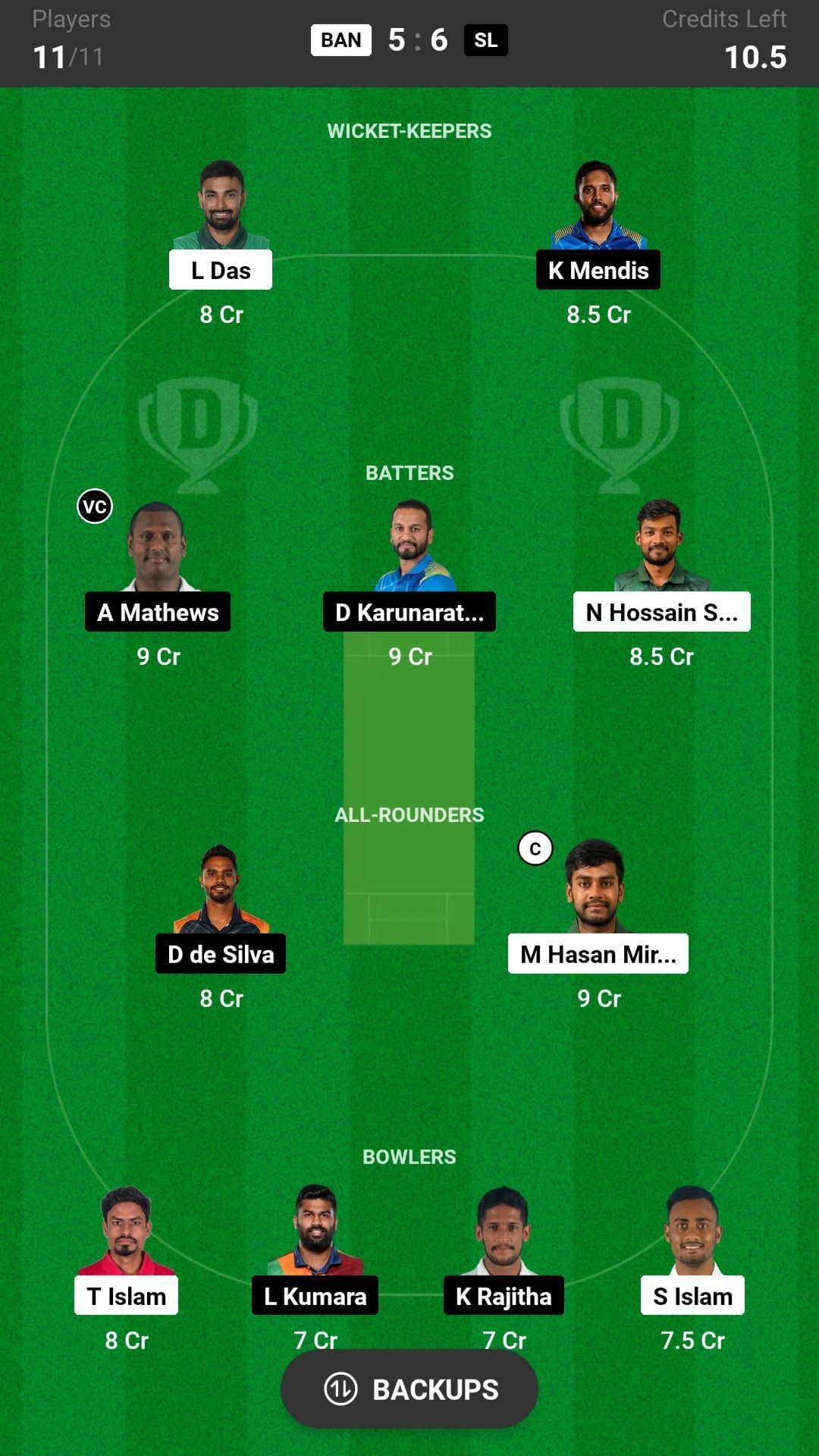 M Hasan Miraz and D de Silva are the best all-rounder picks for the Dream11 team as they are batting in the middle order and will also bowl a lot of overs. R Mendis is another good pick for today's nail-biting match.
