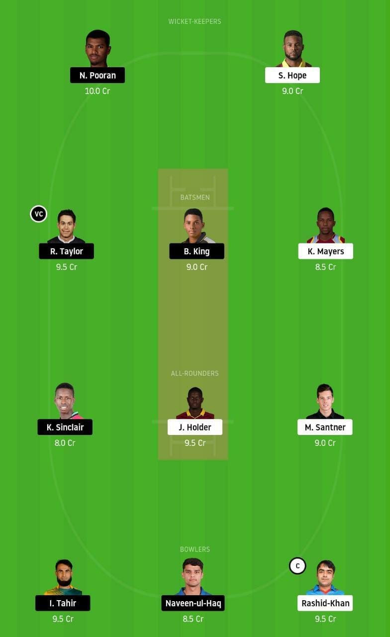 Fantasy Suggestion #1: Nicholas Pooran, Shai Hope, Kyle Mayers, Brandon King, Ross Taylor, Jason Holder, Mitchell Santner, Kevin Sinclair, Rashid Khan, Imran Tahir and Naveen-ul-Haq.