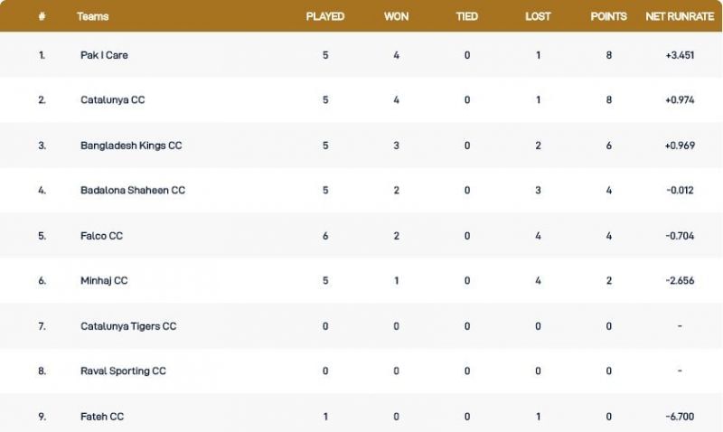 Badalona Shaheen CC and Falco CC occupy the fourth and fifth spots in the points table with 4 points each. Both the teams have won two encounters apiece although the latter have played an extra match.
