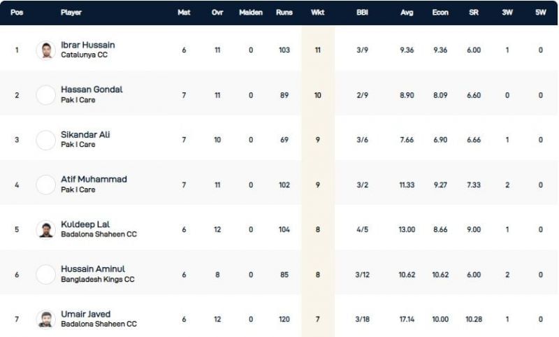 Hassan Gondal of Pak I Care occupies the second spot in the list of highest wicket-takers, having accounted for 10 wickets so far. Gondal has returned figures of 2/9 as his best performance and has a decent economy rate of 8.09.