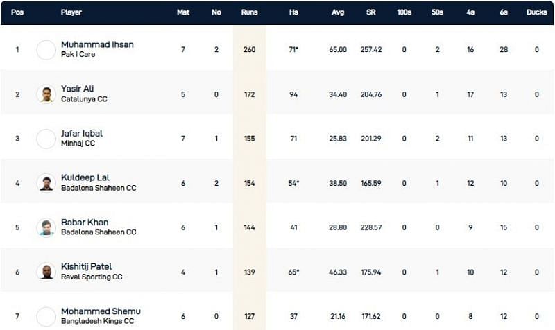 Muhammad Ihsan of Pak I Care is the highest run-scorer after the sixth day of action in the Barcelona T10 League 2020. He has smashed 260 runs in the seven matches he has played with an unbeaten 71 as his best effort. Ihsan has an outstanding strike rate of 257.42 and has struck 16 fours and 28 sixes, the most by far by any batsman.