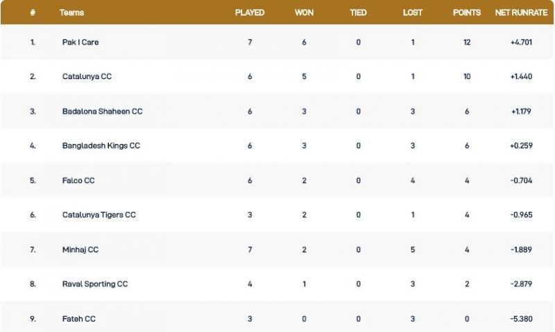 Pak I Care are perched atop the Barcelona T10 League 2020 points table, with twelve points in their kitty. They have emerged victorious in six of the seven matches they have played in the tournament so far and have also qualified for the semi-finals.