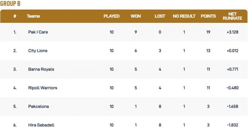 The standings in the four groups of the Barcelona T10 League 2021 are as follows: