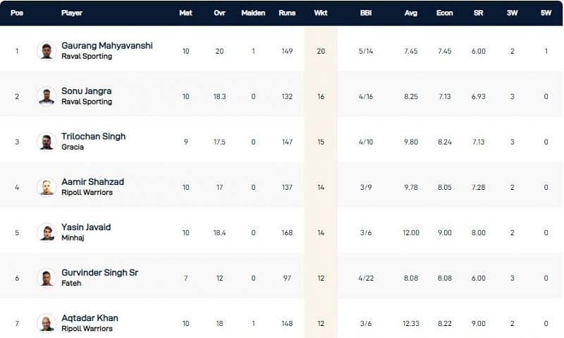 Sonu Jangra, who has accounted for 16 opposition batsmen, follows his teammate in the wicket-taking charts. He has a best effort of 4/16 and has conceded an average of 7.13 runs per over.