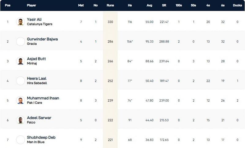 Yasir Ali of the Catalunya Tigers continues to be the highest run-scorer in the Barcelona T10 League 2021. He has scored 330 runs in the seven matches he has played, with a 116-run knock as his best effort. Ali has scored his runs at an impressive strike rate of 221.47, with the help of 20 fours and 32 sixes.