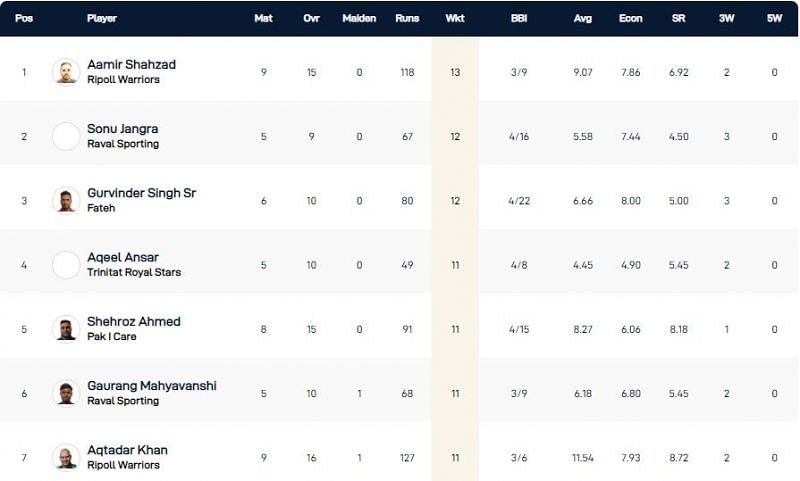 Sonu Jangra of Raval Sporting and Gurvinder Singh Sr of Fateh follow Shahzad with 12 wickets each. The former is placed higher on the wicket-taking charts by virtue of having a better economy rate.