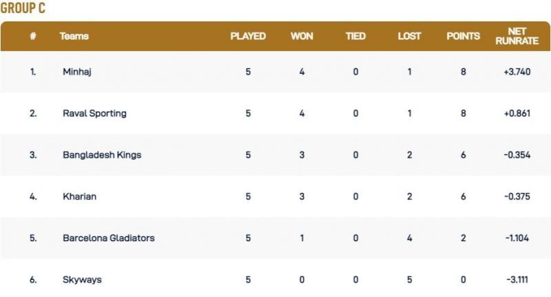 Bangladesh Kings and Kharian are placed third and fourth on the Group C points table. The two teams have six points apiece and are separated by their net run rates.