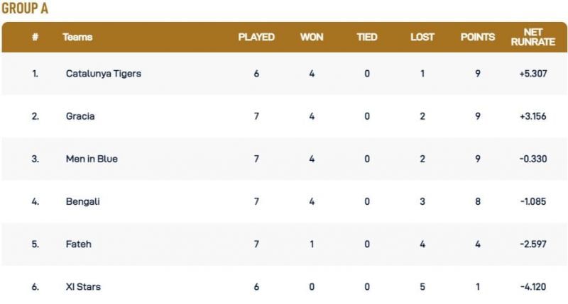 Apart from Gurwinder Bajwa and Yasir Ali, Catalunya Tigers' Mustansar Iqbal (195), Bengali's Shafiqur Rahman (181), and Men in Blue's Shankar Kaligatla (170) are the highest run-scorers from the Group A teams. They are followed by Kuldeep Lal (165) of Gracia and the Bengali duo of Omar Ali (110) and Riaz Howlader (105).