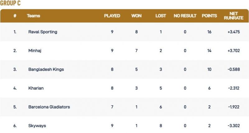 The Bangladesh Kings are placed third in Group C of the Barcelona T10 League 2021. They have registered five wins in eight matches but are out of contention for a knockout stage berth.