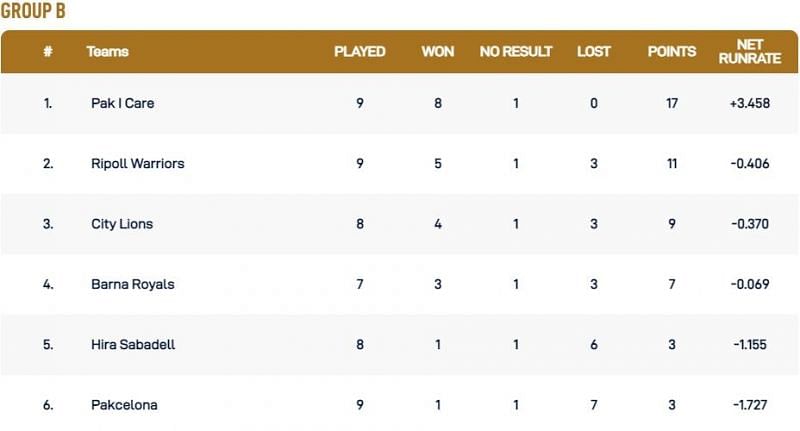 The standings in the four groups of the Barcelona T10 League 2021 are as follows:
