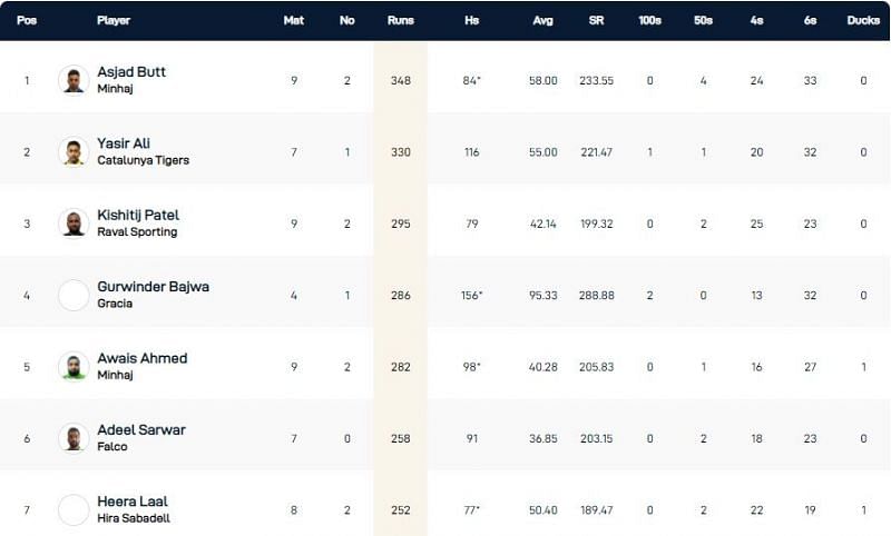 Yasir Ali of the Catalunya Tigers has dropped to second spot in the run-scoring charts. He has amassed 330 runs in seven innings, with a 116-run knock being his best effort. Ali has an impressive strike rate of 221.47, and has struck 20 fours and 32 maximums.