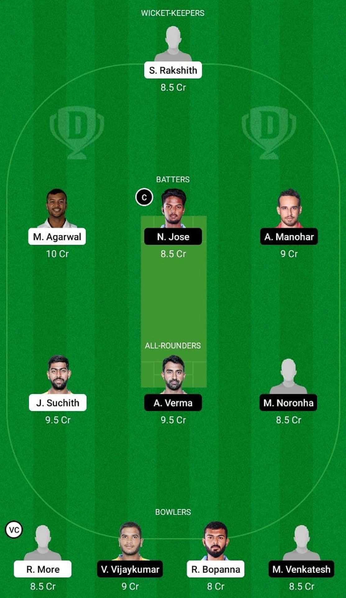 Fantasy Suggestion #2: Shivkumar Rakshith, Nikin Jose, Mayank Agarwal, Abhinav Manohar, Amit Verma, Jagadeesha Suchith, Macneil Noronha, Vyshak Vijaykumar, M Venkatesh, Ronit More, Rishi Bopanna.