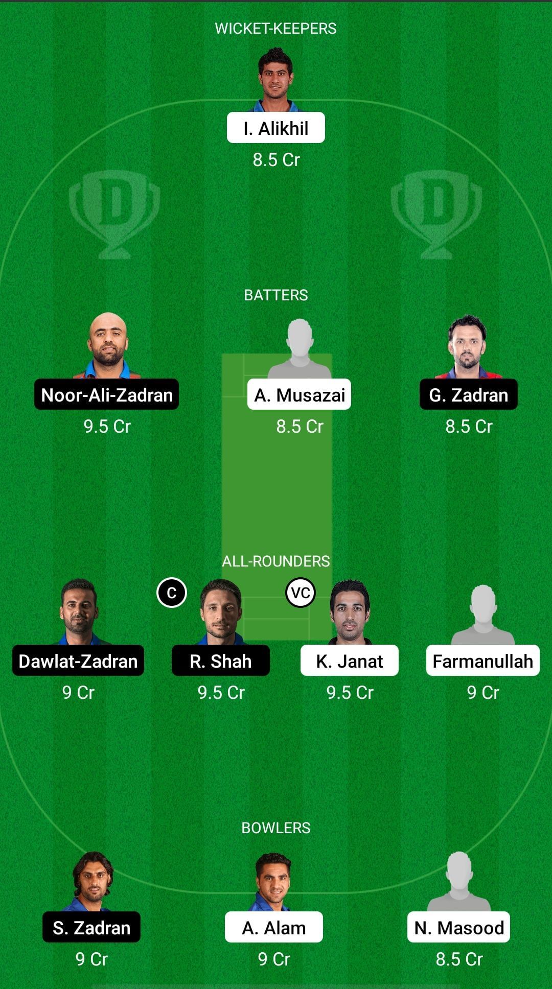 Fantasy Suggestion #1: Ikram Alikhil, Noor-Ali-Zadran, Fazal Zazai, Asif Musazai, Dawlat-Zadran, Rahmat Shah, Karim Janat, Farmanullah, Shapoor Zadran, Sayed Shirzad, Aftab Alam.