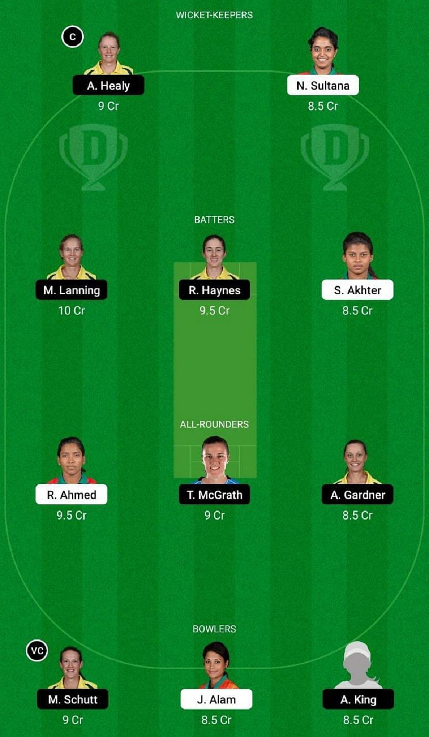 Fantasy Suggestion #1: Alyssa Healy, Nigar Sultana, Meg Lanning, Rachael Haynes, Sharmin Akhter, Rumana Ahmed, Tahlia McGrath, Ashleigh Gardner, Megan Schutt, Jahanara Alam and Alana King.