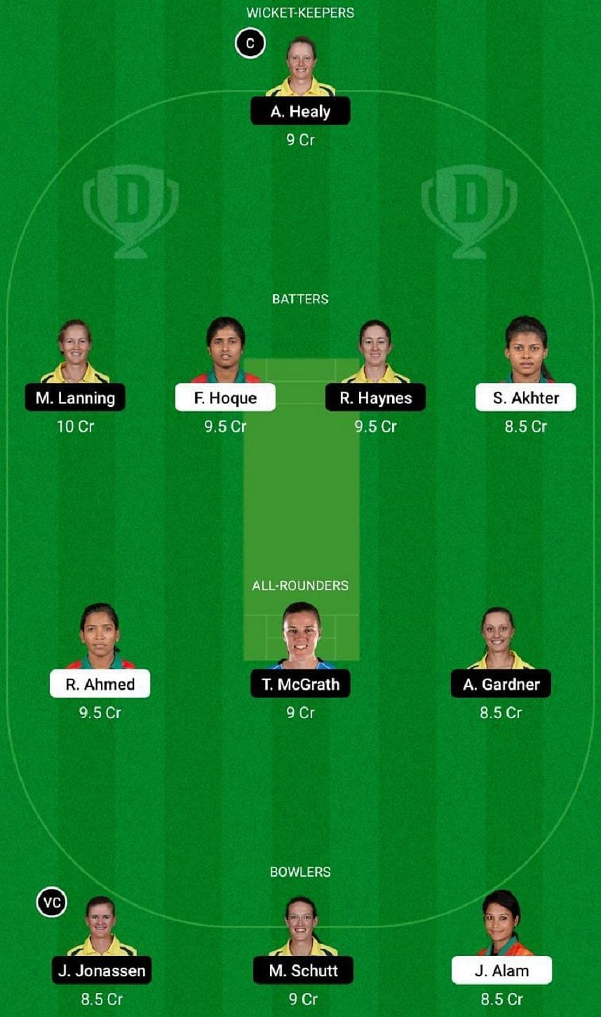 Fantasy Suggestion #2: Alyssa Healy, Fargana Hoque, Meg Lanning, Rachael Haynes, Sharmin Akhter, Rumana Ahmed, Tahlia McGrath, Ashleigh Gardner, Megan Schutt, Jahanara Alam and Jess Jonassen.