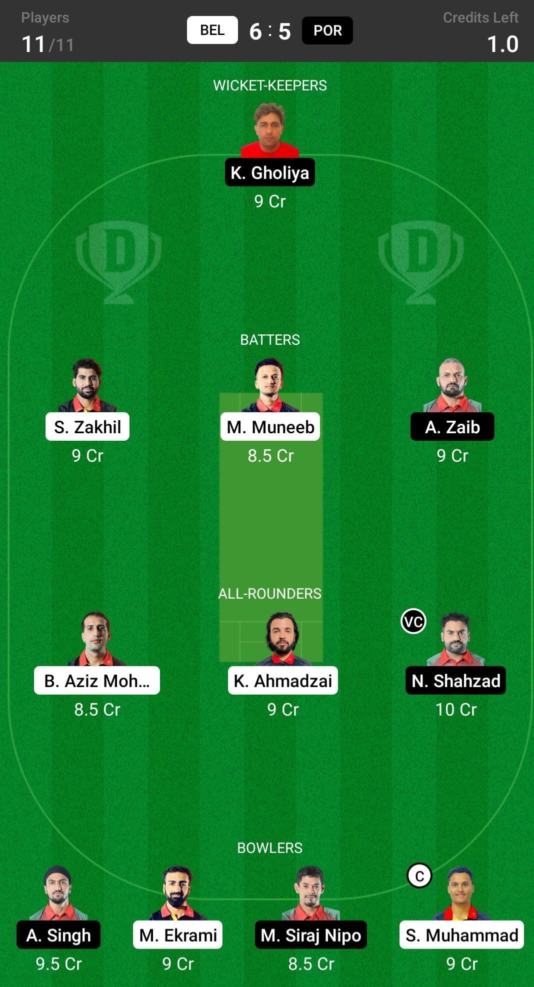 Fantasy suggestion #1: K Gholiya, S Zakhil, A Zaib, M Muneeb, B Aziz Mohammad, K Ahmadzai, N Shahzad, M Siraj, S Muhammad, M Ekrami, A Singh