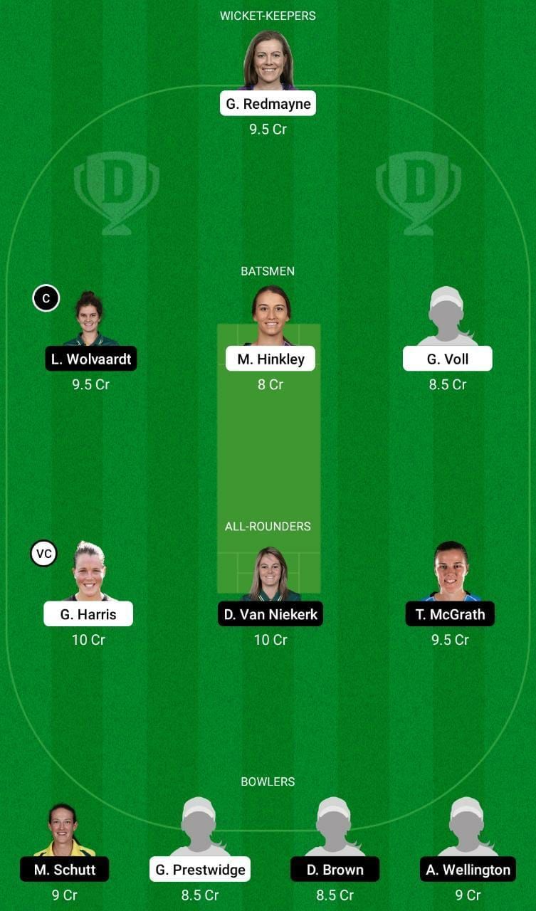 Fantasy Suggestion #1: Georgia Redmayne, Laura Wolvaardt, Mikayla Hinkley, Georgia Voll, Grace Harris, Dane van Niekerk, Tahlia McGrath, Megan Schutt, Georgia Prestwidge, Darcie Brown and Amanda Wellington