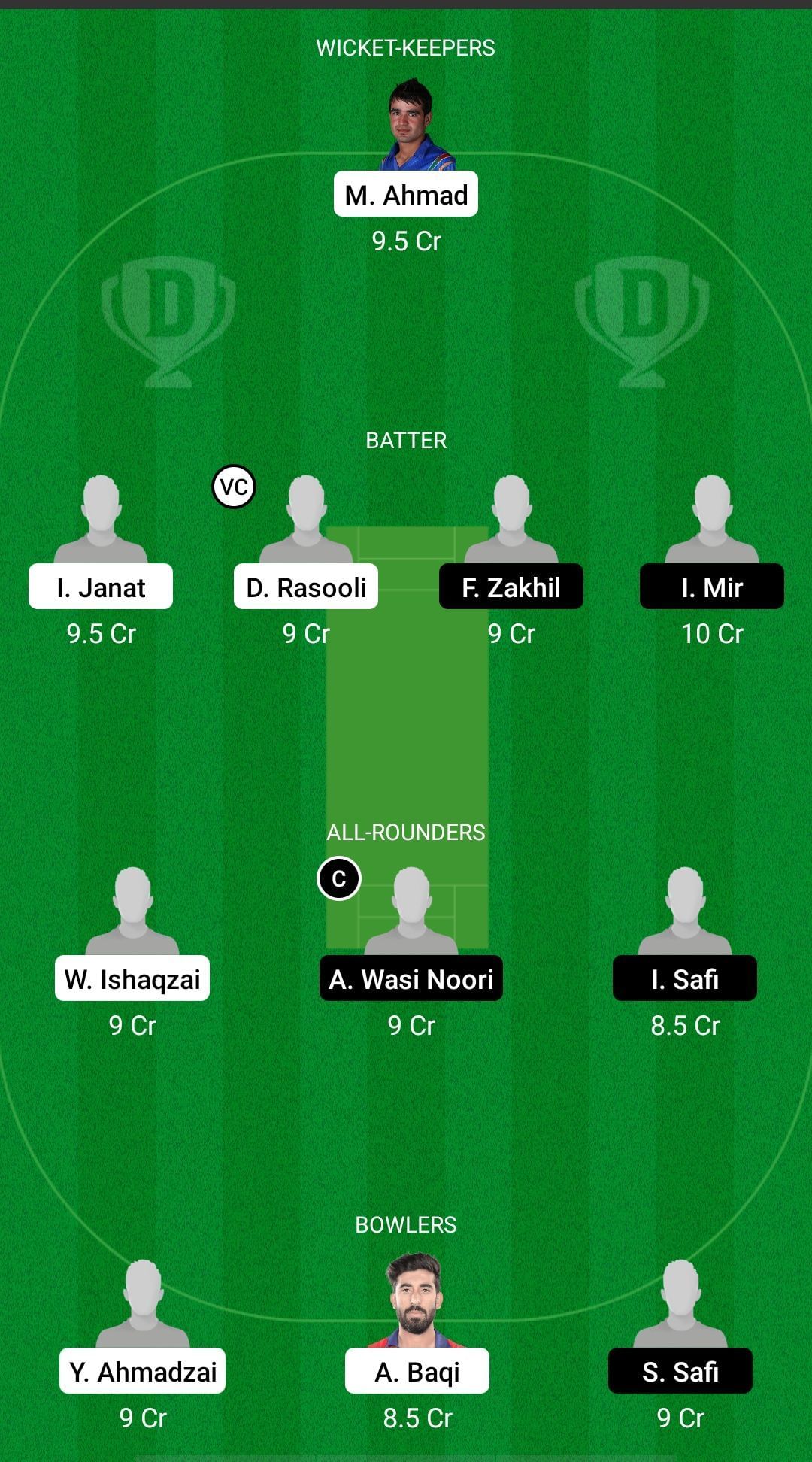 Fantasy Suggestion #2: Munir Ahmad, Ihsanullah, Darwish Rasooli, Farhan Zakhil, Wagarullah Ishaq, Abidullah Taniwal, Abdul Wasi, Ibrahim Safi, Yamin Ahmadzai, Abdul Baqi, Zohaib Ahmadzai.