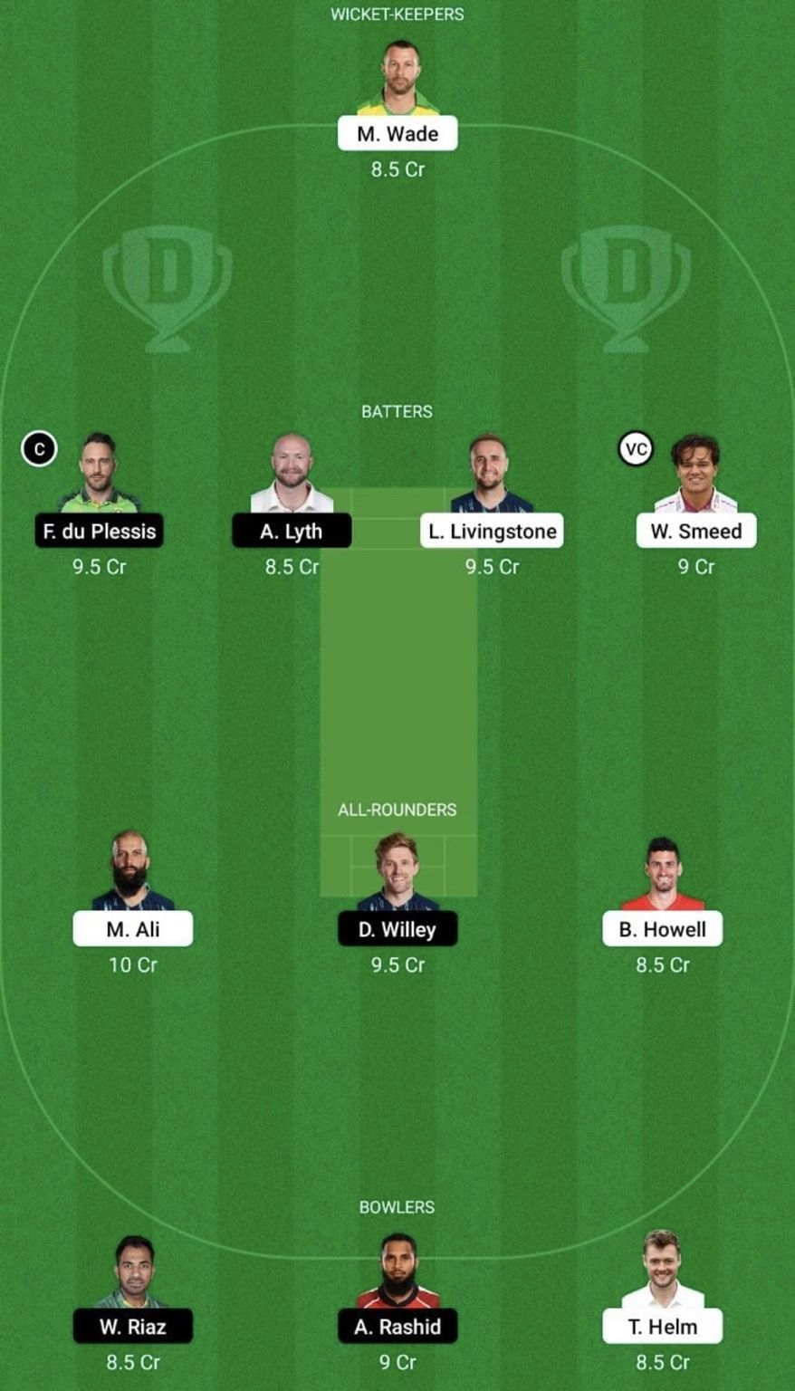 Fantasy Suggestion #2: Matthew Wade, Faf du Plessis, Liam Livingstone, Will Smeed, Adam Hose, Moeen Ali, David Willey, Benny Howell, Adil Rashid, Dwayne Bravo and Tom Helm.