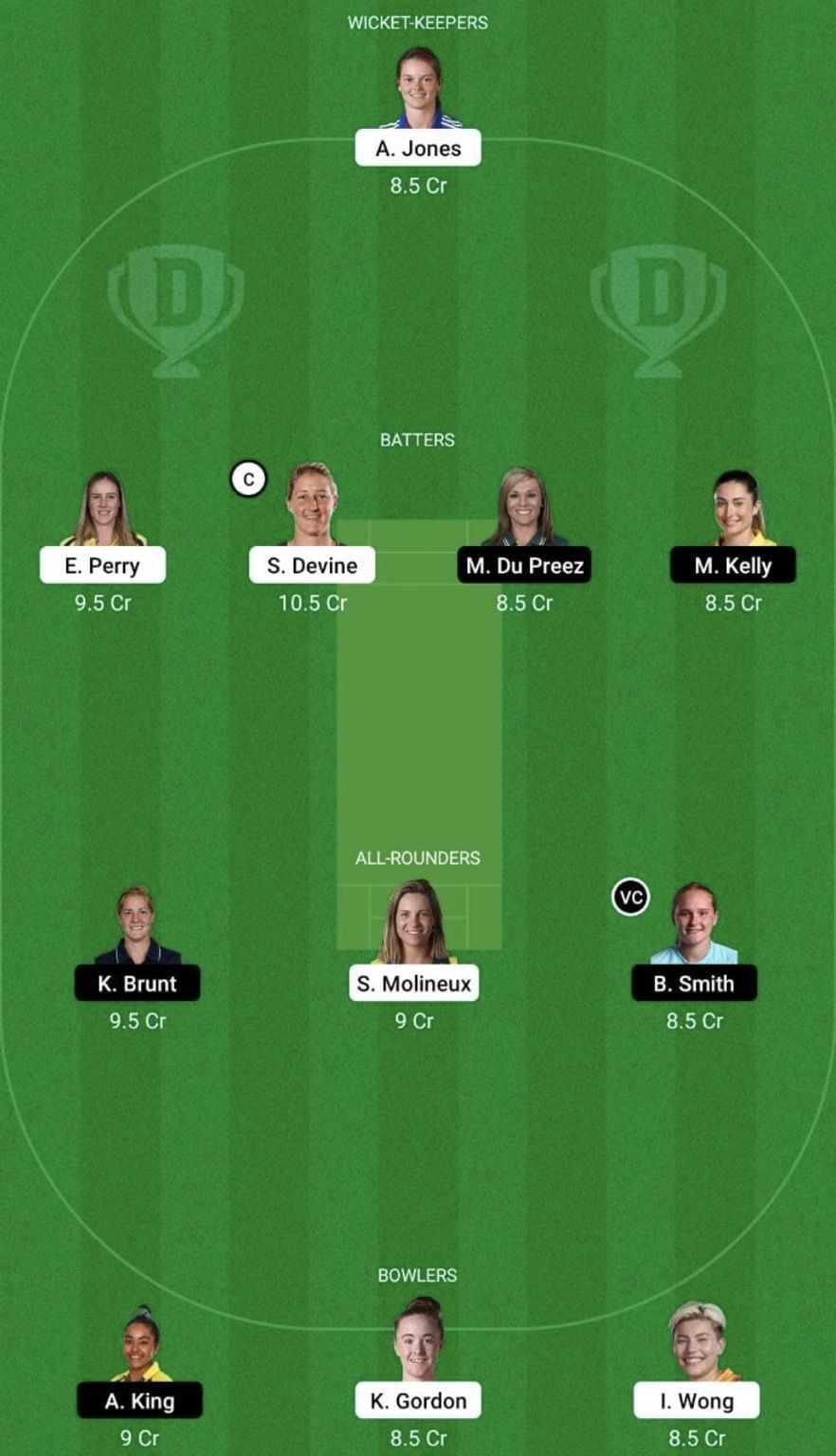 Fantasy Suggestion #1: Amy Jones, Ellyse Perry, Sophie Devine, Mignon du Preez, Marie Kelly, Katherine Brunt, Sophie Molineux, Bryony Smith, Alana King, Kirstie Gordon and Issy Wong.