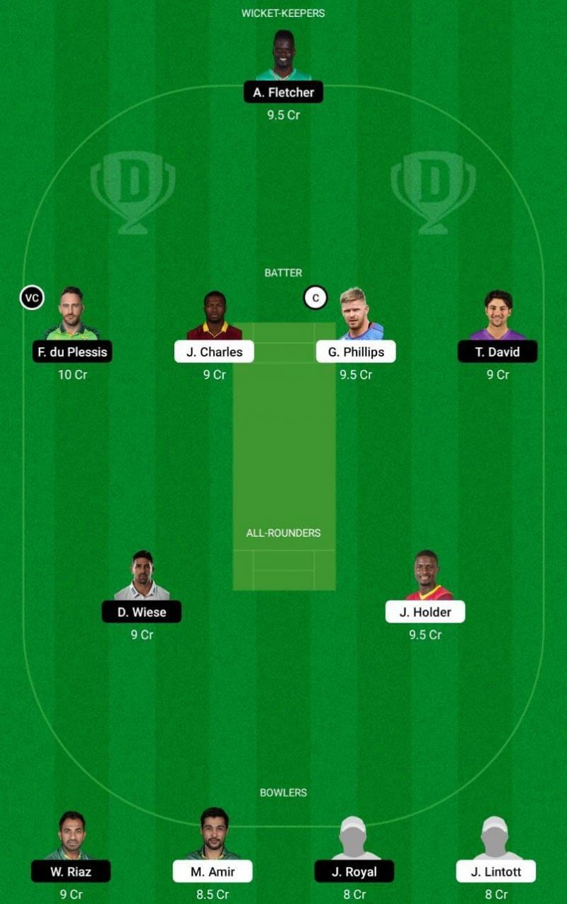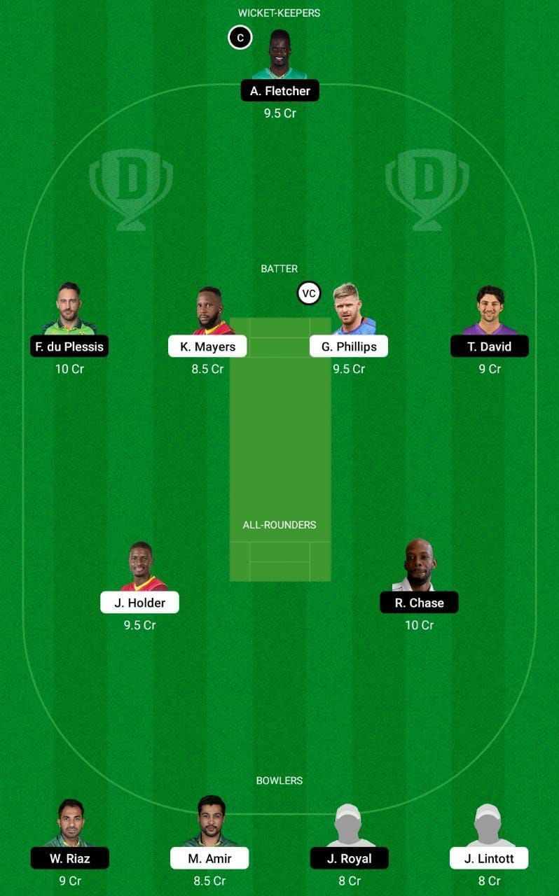 Fantasy Suggestion #1: Andre Fletcher, Faf du Plessis, Tim David, Glenn Phillips, Kyle Mayers, Roston Chase, Jason Holder, Wahab Riaz, Mohd Amir, Jake Lintott and Jeavor Royal