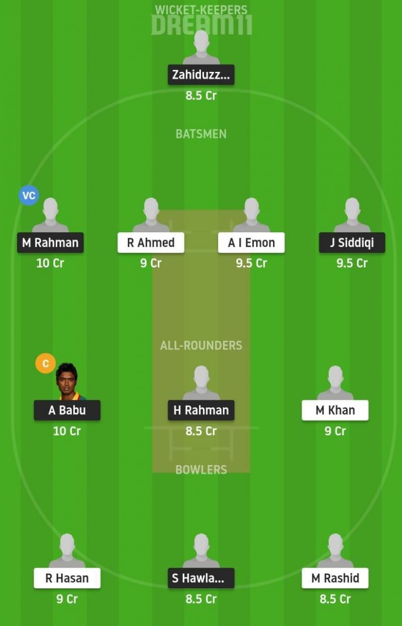 Fantasy Suggestion #1: Zahiduzzaman, M Rahman, A I Emon, R Ahmed, J Siddiqi, A Babu, M Khan, H Rahman, R Hasan, S Hawlader, M Rashid