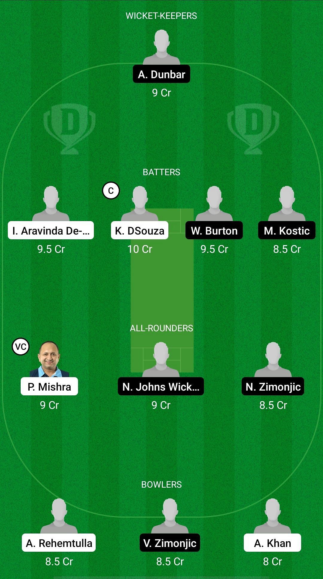 Fantasy Suggestion #1: Adrian Leslie Dunbar, Ishan Aravinda De Silva, Kevin Dsouza, Wintley Burton, Matthew Kostic, Prakash Mishra, Nicholas Johns Wickberg, Nemanja Zimonjic, Asad Ali Rehemtullah, Vukasin Zimonjic, Ahsan Khan.