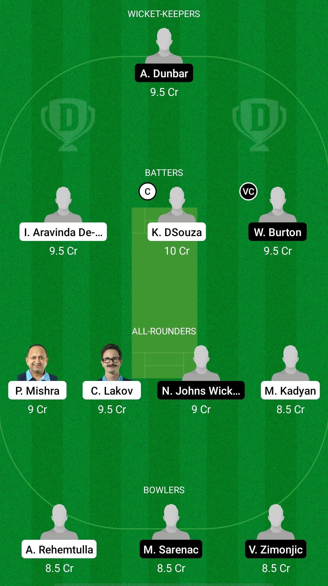 Fantasy Suggestion #2: Adrian Leslie Dunbar, Ishan Aravinda De Silva, Kevin Dsouza, Wintley Burton, Alexander Dizija, Prakash Mishra, Hristo Lakov, Mukul Kadyan, Nicholas Johns Wickberg, Asad Ali Rehemtullah, Vukasin Zimonjic, Matija Sarenac.