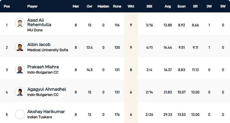 Asad Ali Rehemtulla of MU Dons and Albin Jacob of Medical University Sofia have emerged as the highest wicket-takers of the Bulgaria T10 League 2020 before the knockout stage encounters. Both of them have taken 9 wickets each, with the former occupying the top spot on the list due to his better strike rate of 8.66.