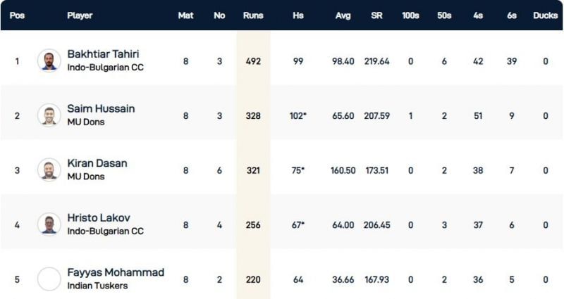 With Bakhtiar Tahiri having built a huge lead at the top of the highest run-scorers list of the Bulgaria T10 League 2020, it might be difficult for any of the other batsmen to go past him with just two innings left to be played.