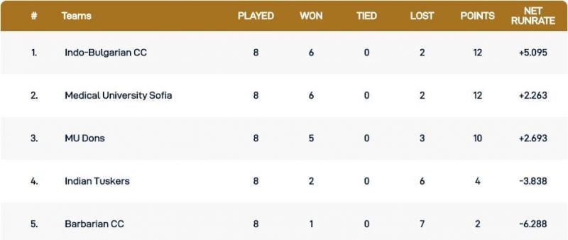 Indo-Bulgarian CC and Medical University Sofia registered wins in six of the eight matches each of the two teams played in the league phase. While the two teams shared the couple of encounters between them, the former's other reversal came against Indian Tuskers with the latter losing a match against MU Dons.