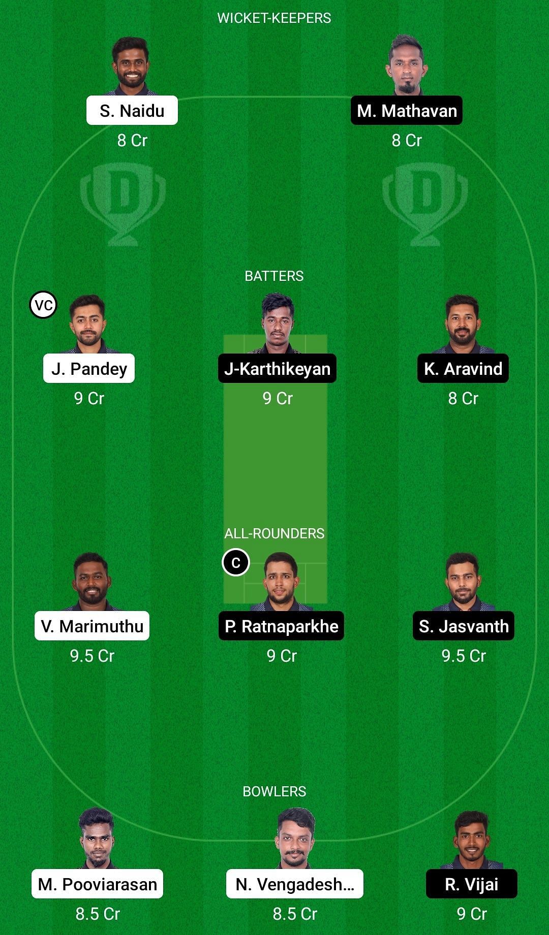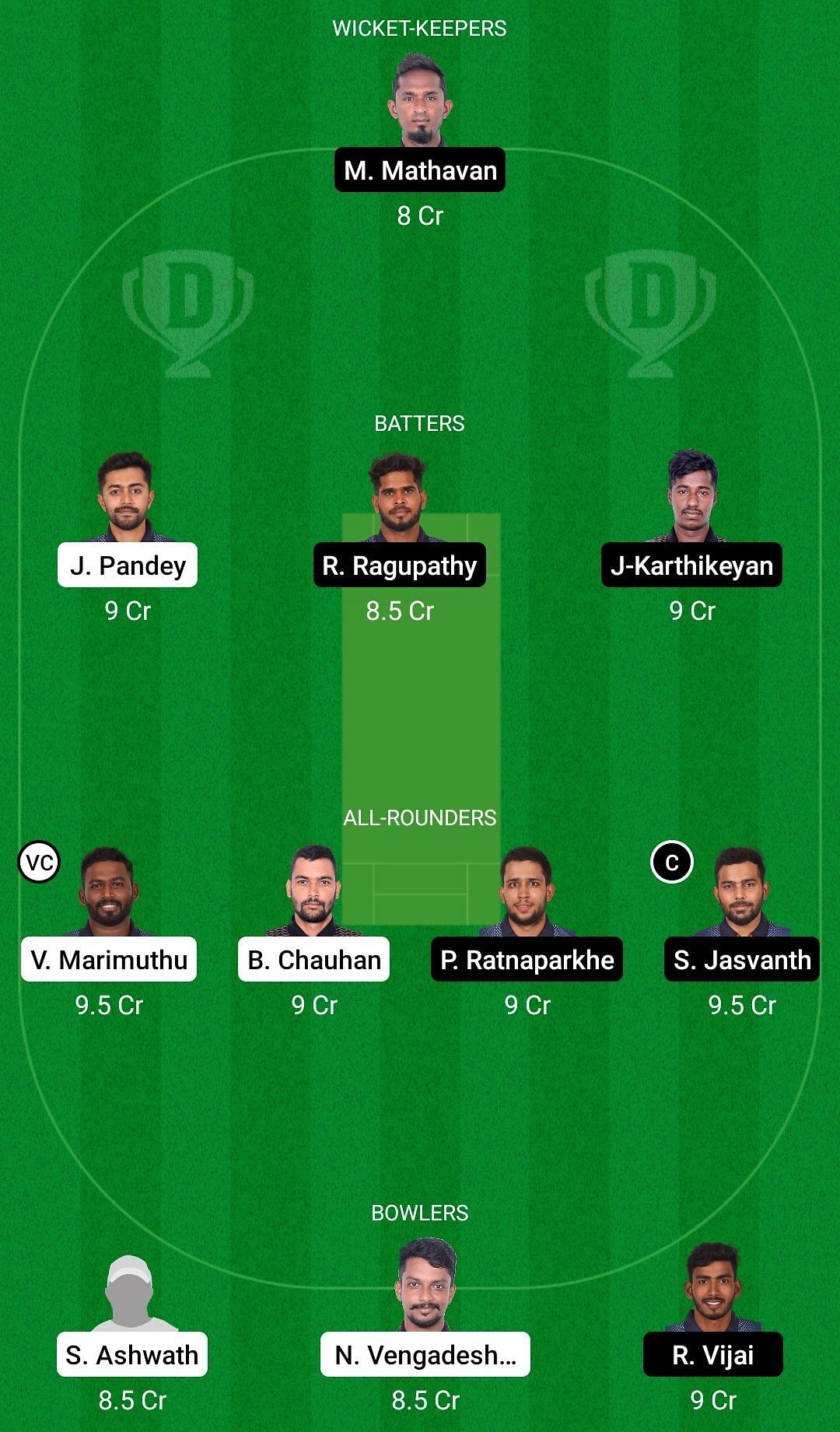 Fantasy Suggestion #1: M Mathavan, Jay Pandey, R Ragupathy, J Karthikeyan, Vikneshwaran Marimuthu, Bhupender Chauhan, Paras Ratnaparkhe, S Jasvanth, S Ashwath, N Vengadeshwaran, R Vijai