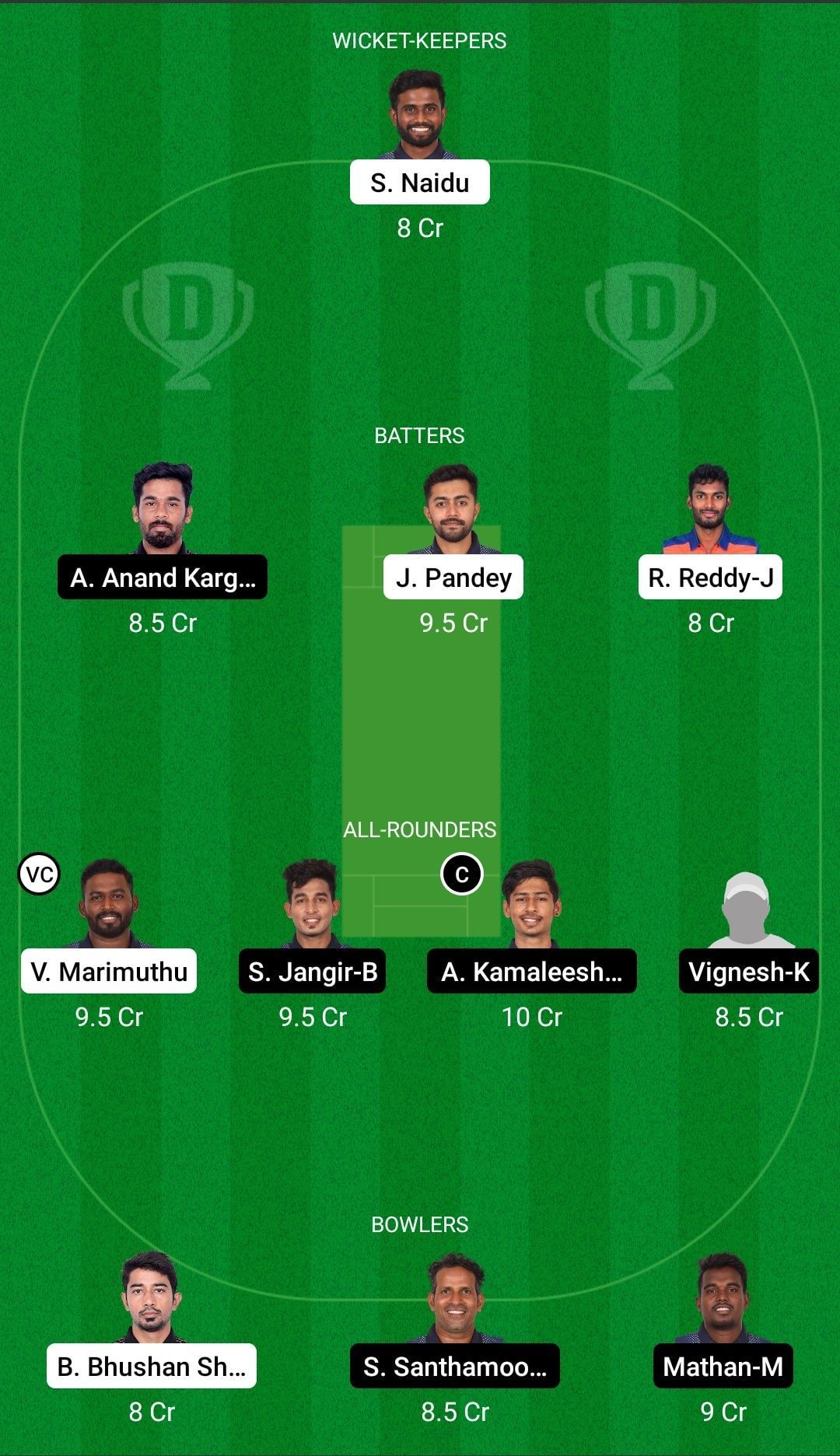 Fantasy Suggestion #2: Siddharth Naidu, Akash Anand Kargave, Jay Pandey, Rajasekar Reddy J, Vikneshwaran Marimuthu, Satish Jangir B, A Kamaleeshwaran, K Vignesh, Bharat Bhushan Sharma, SanthaMoorthy.