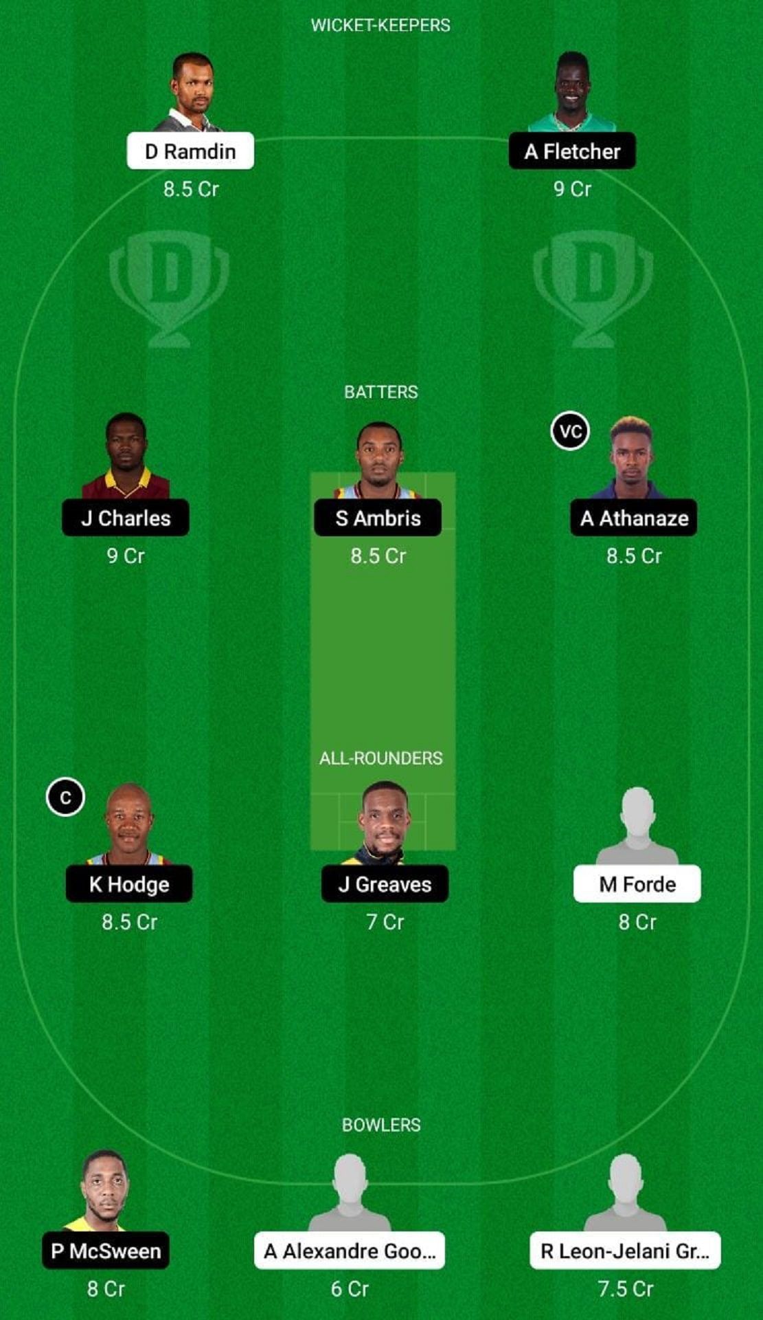 Johnson Charles, Alick Athanaze, Kavem Hodge, Sunil Ambris, Andre Fletcher (c), Justin Greaves, Tevyn Walcott (wk), Ryan John, Sadrack Descarte, Preston McSween, and Kenneth Dember.