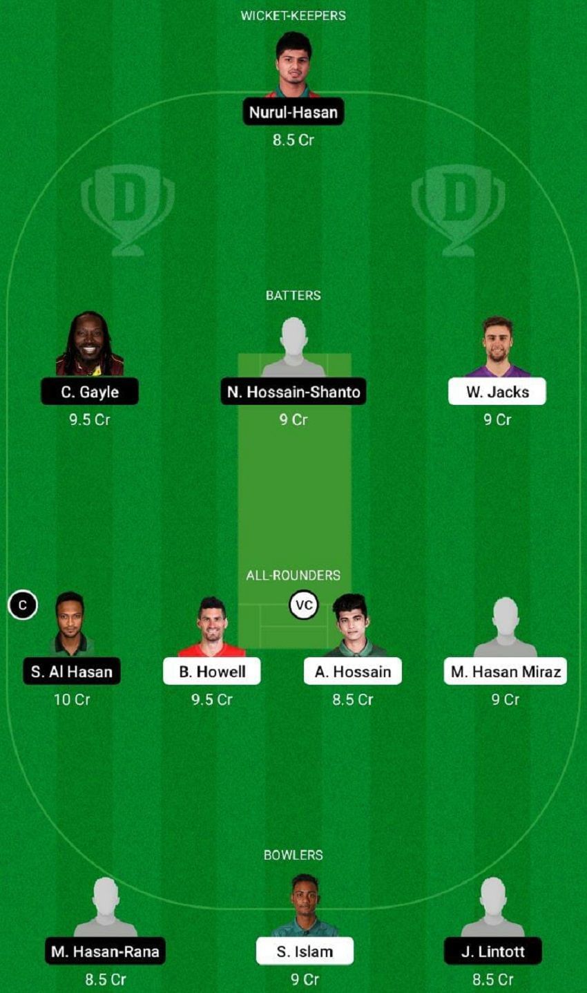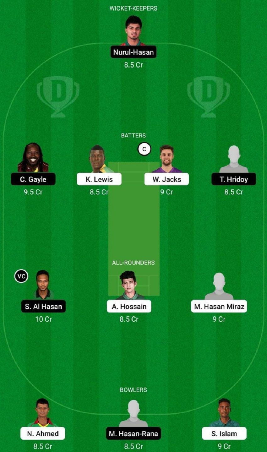 Fantasy Suggestion #1: Nurul Hasan, Chris Gayle, Kennar Lewis, Will Jacks, Towhid Hridoy, Shakib Al Hasan, Afif Hossain, Mehidy Hasan Miraz, Nasum Ahmed, Mahedi Hasan Rana and Shoriful Islam