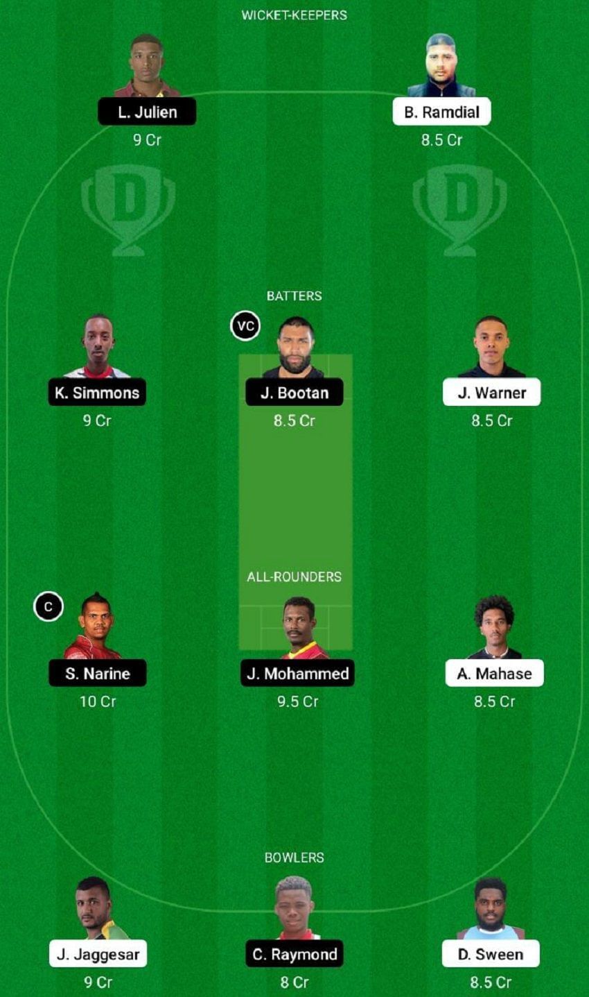 Fantasy Suggestion #1: L Julien, B Ramdial, K Simmons, J Bootan, J Warner, S Narine, J Mohammed, A Mahase, J Jaggesar, C Raymond and D Sween.