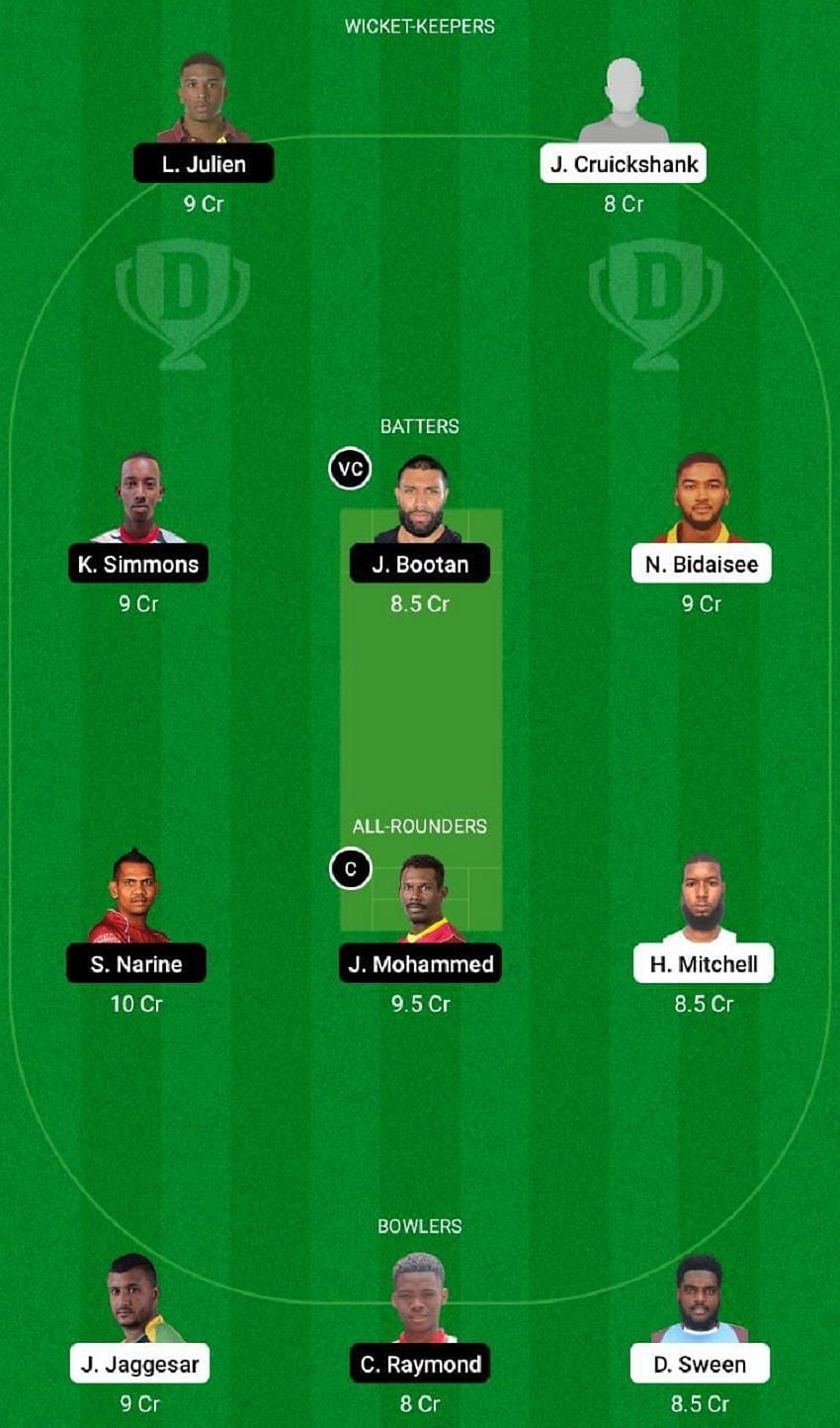 Fantasy Suggestion #2: L Julien, J Cruickshank, K Simmons, J Bootan, N Bidaisee, S Narine, J Mohammed, H Mitchell, J Jaggesar, C Raymond and D Sween.