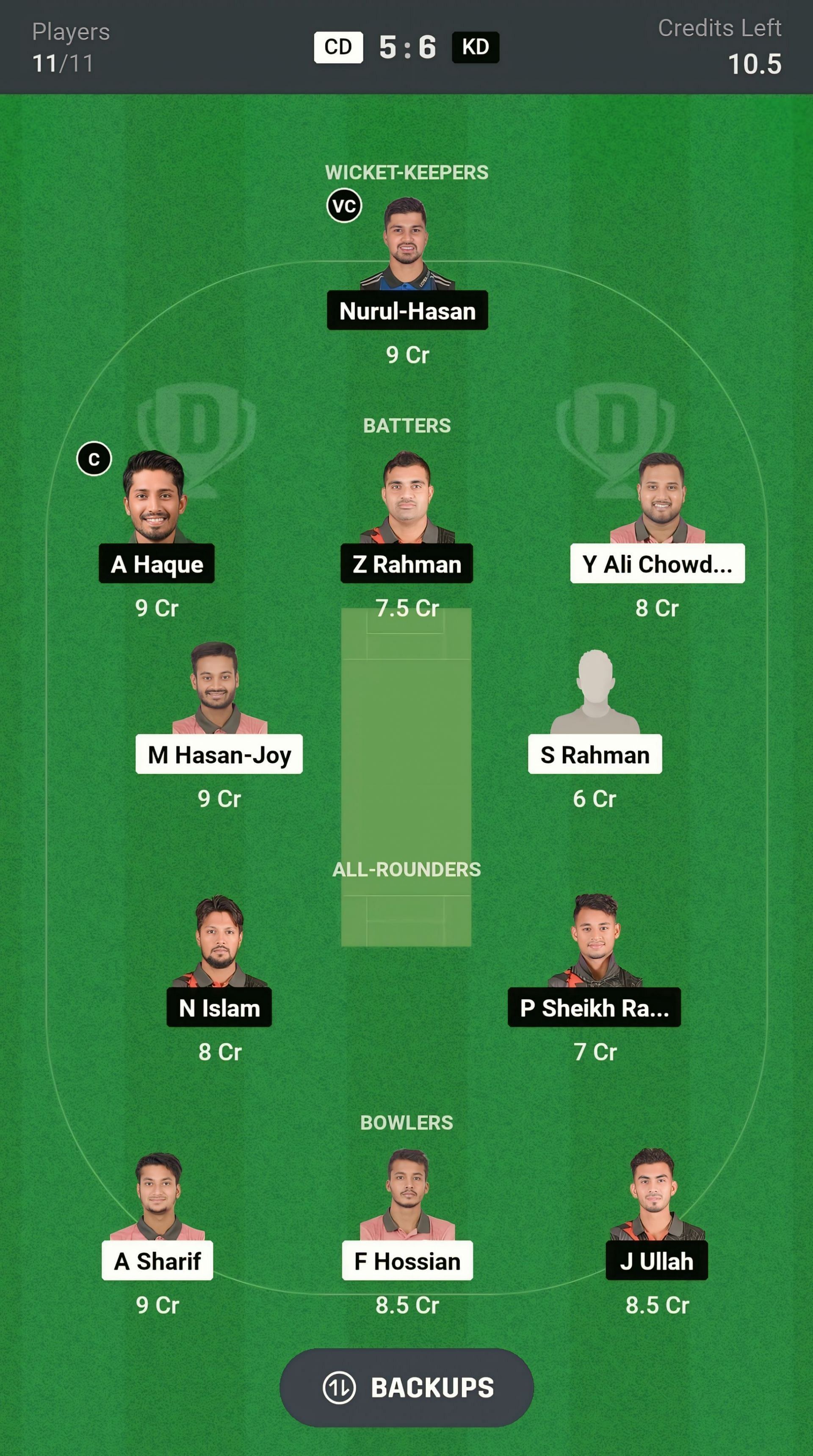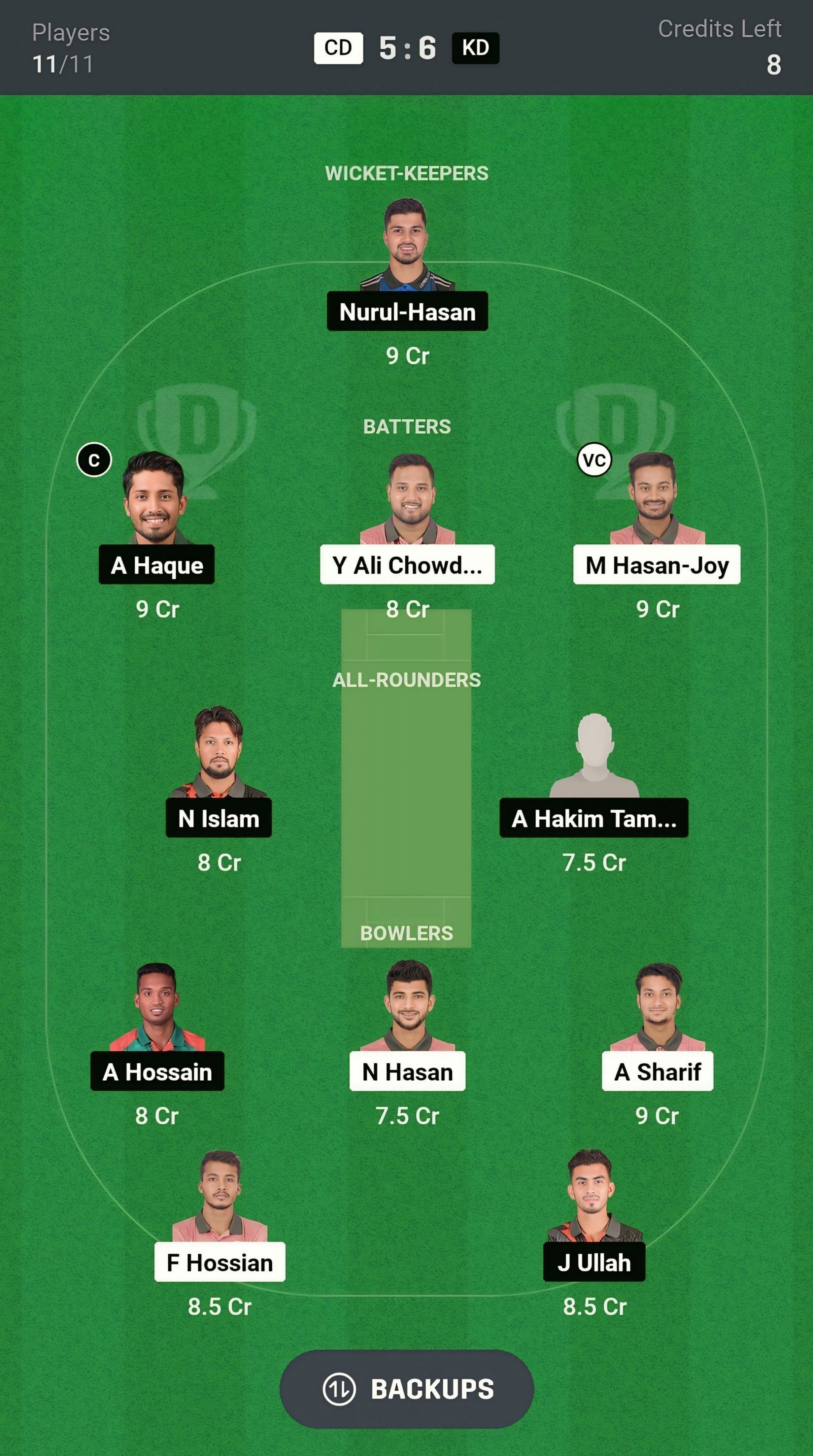 A Hakim and N Islam are the best all-rounder picks for the Dream11 team. Both players will play crucial roles in today's match. N Islam will bat in the middle order and bowl a good number of overs in today's match. P Sheikh Rahman is another good all-rounder for today's nail-biting match.