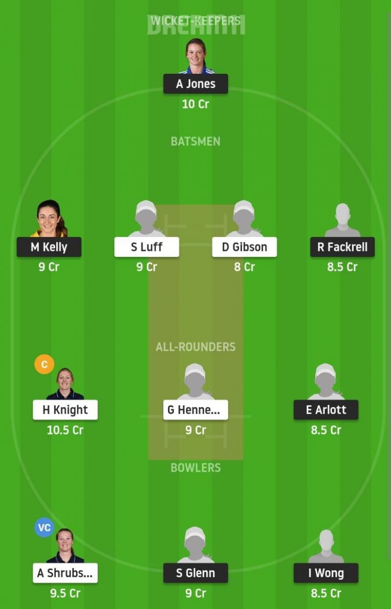 Fantasy Suggestion #1: A Jones, S Luff, M Kelly, R Fackrell, D Gibson, H Knight, G Hennessy, E Arlott, A Shrubsole, I Wong, S Glenn