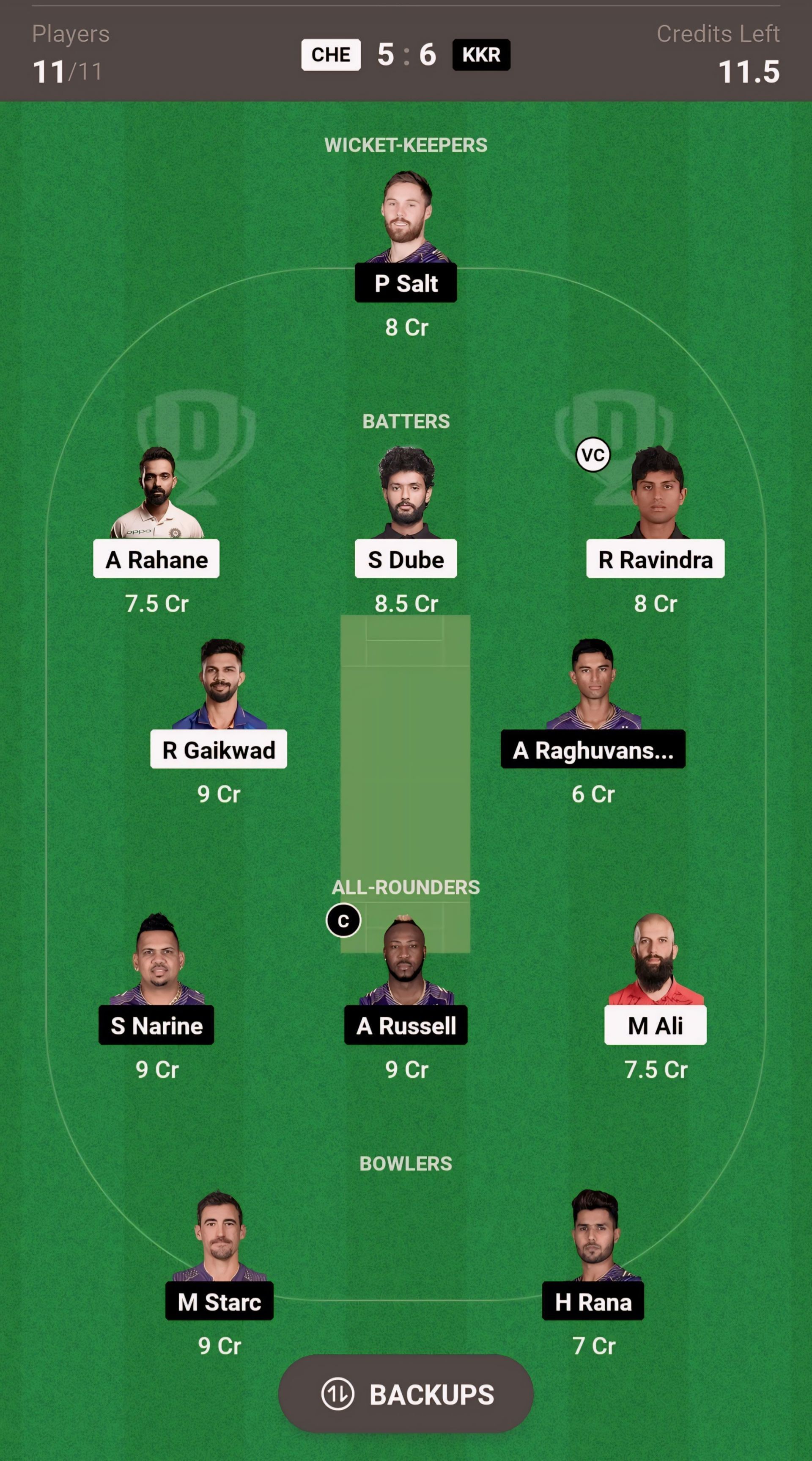 Batters: R Gaikwad, S Dube, R Ravindra (vc), A Rahane, A Raghuvanshi