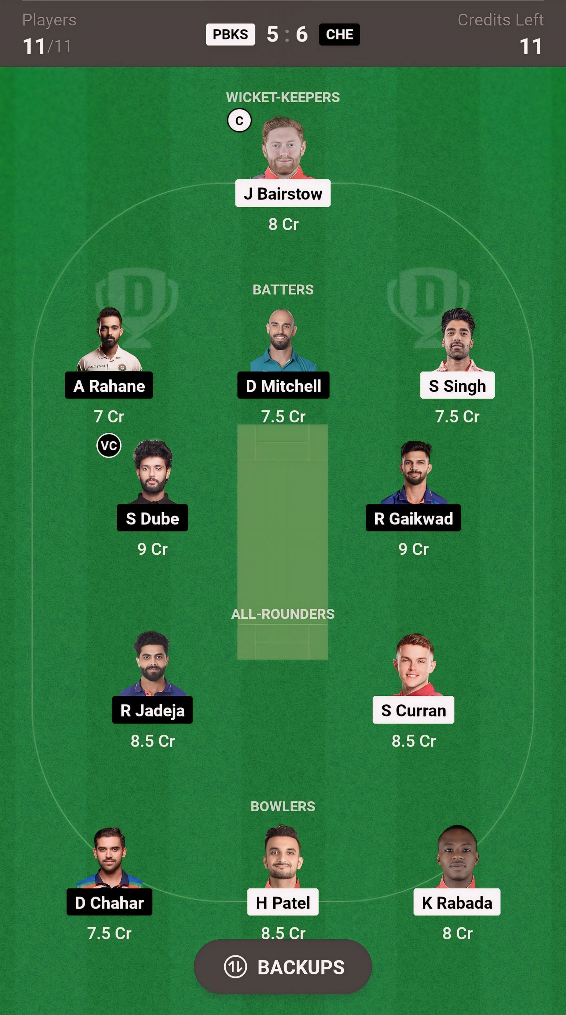 Batters: R Gaikwad, S Dube, D Mitchell, S Singh, A Rahane