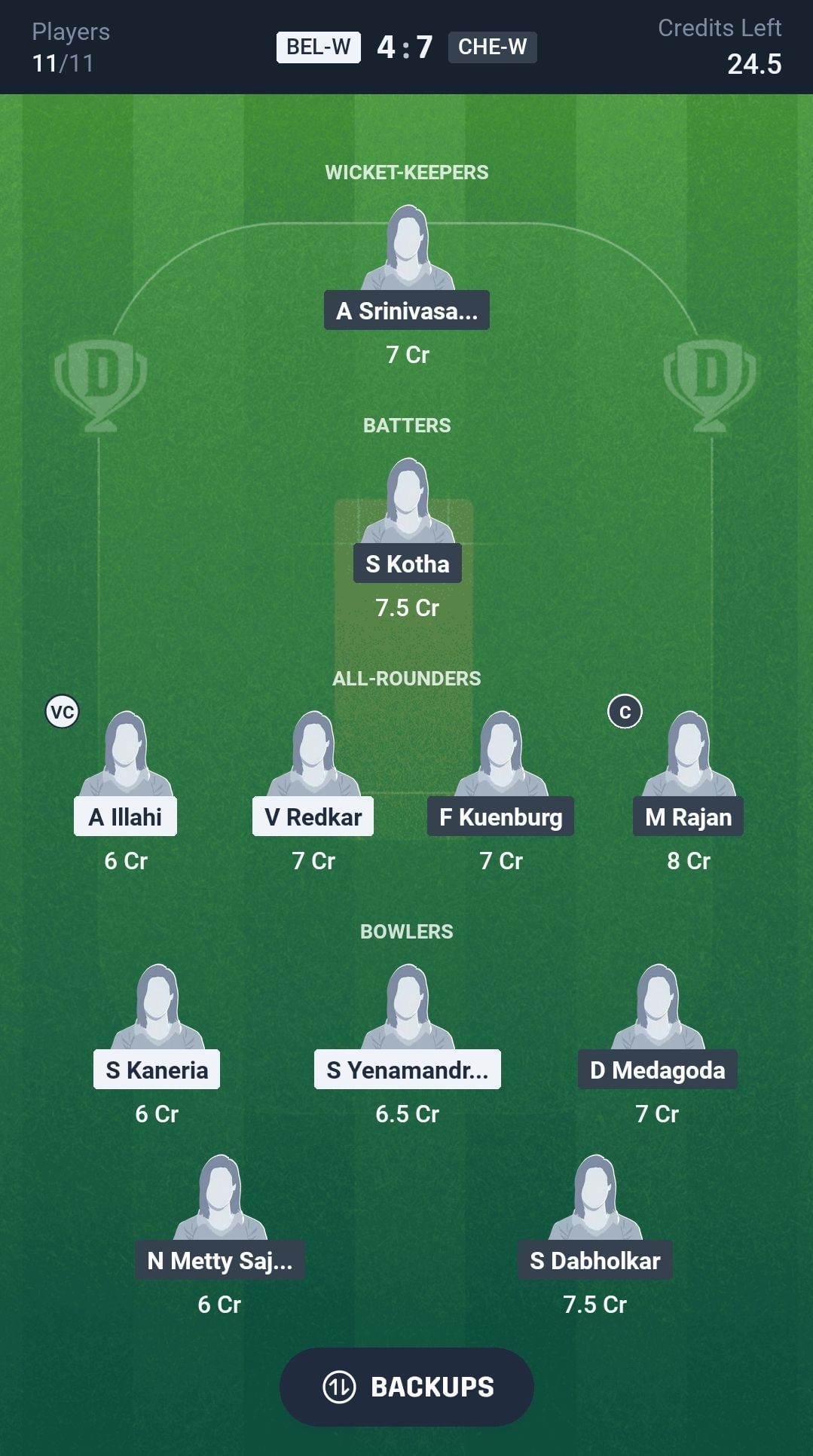 CHE-W vs BEL-W match captain and vice-captain choices
