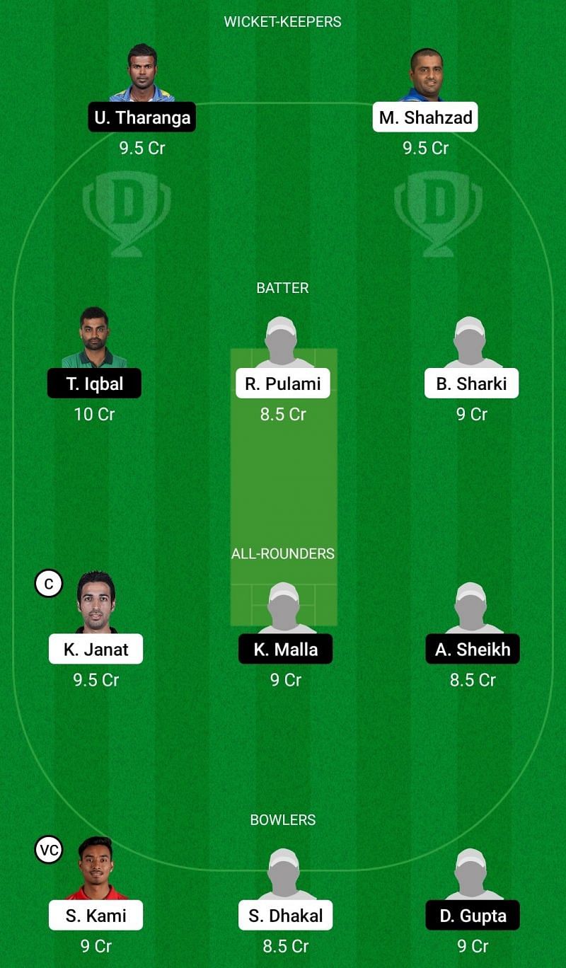 Fantasy Suggestion #1: Upul Tharanga, Mohammad Shahzad, Tamim Iqbal, Rajesh Pulami, Bhim Sharki, Karim Janat, Kushal Malla, Aarif Sheikh, Sompal Kami, Sagar Dhakal, Durgesh Gupta