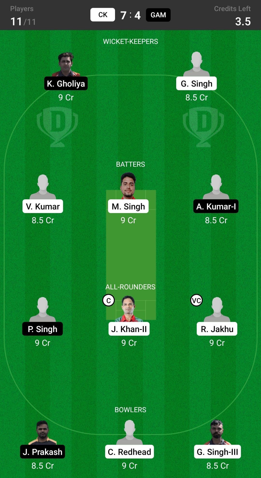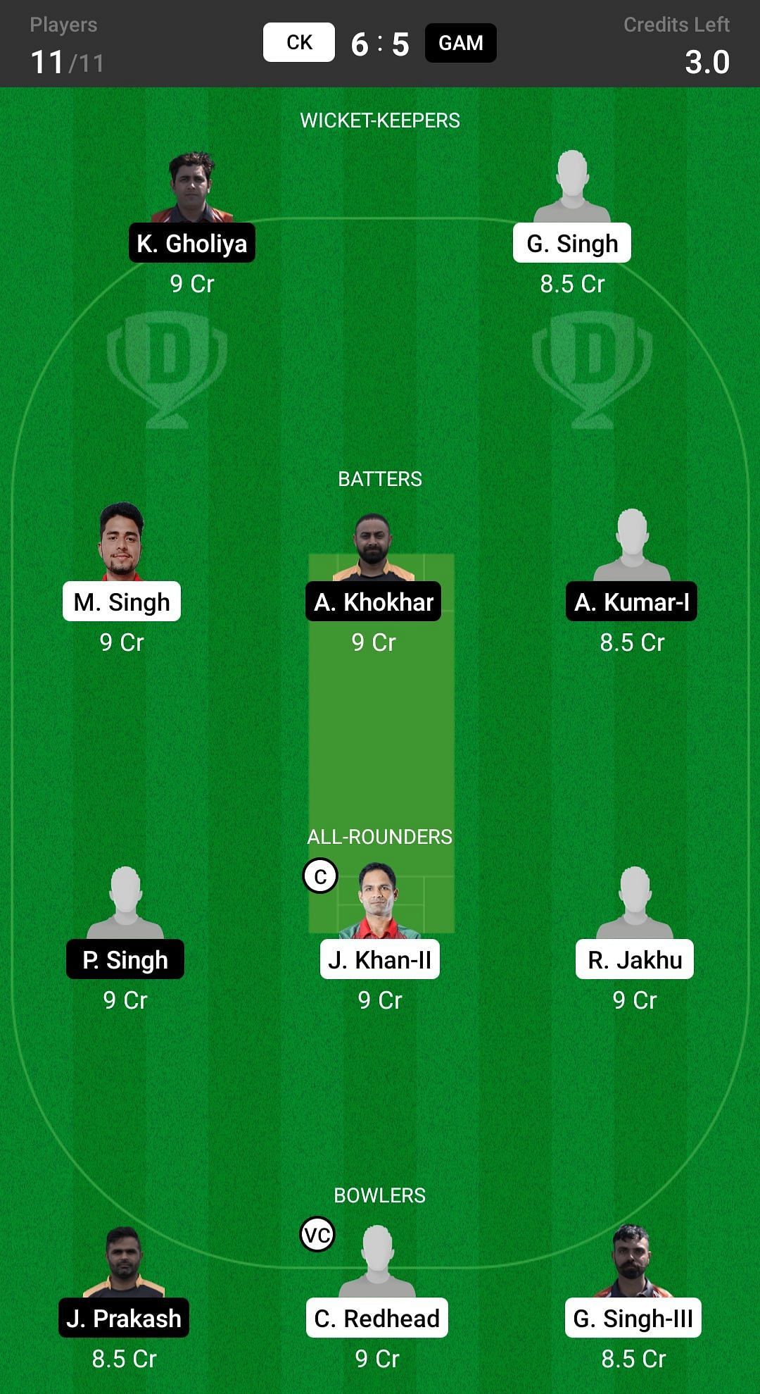 Fantasy suggestion #1: K Gholiya, G Singh, A Kumar, V Kumar, M Singh, J Khan-II, P Singh, R Jakhu, C Redhead, G Singh-III, J Prakash.