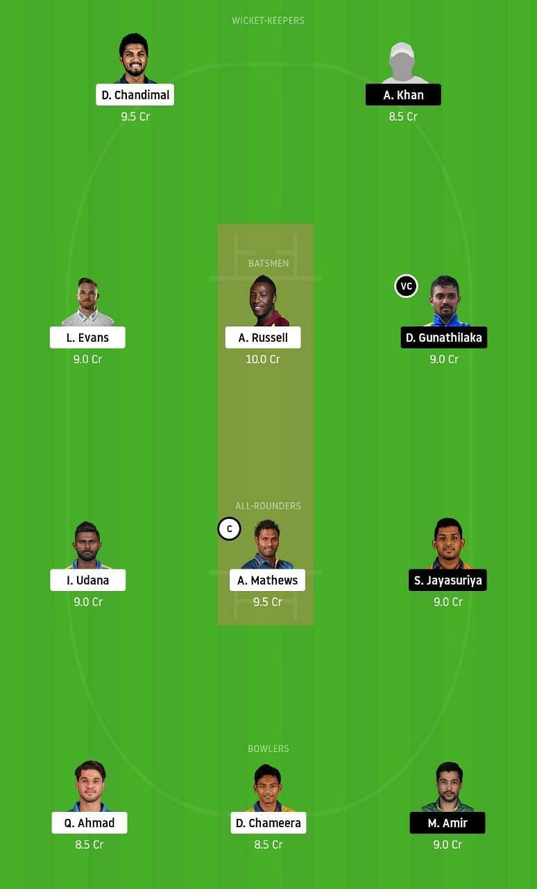Fantasy Suggestion #1: Dinesh Chandimal, Azam Khan, Danushka Gunathilaka, Andre Russell, Laurie Evans, Isuru Udana, Angelo Mathews, Shehan Jayasuriya, Qais Ahmad, Dushmanta Chameera and Mohd Amir