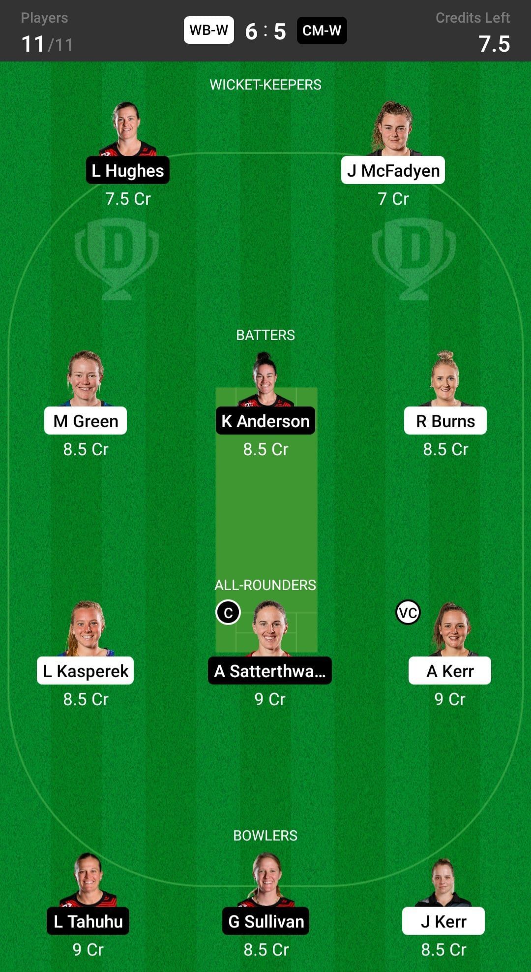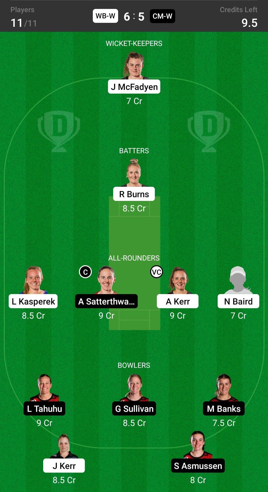 L Kasperek and A Satterthwaite are the best all-rounder picks for the Dream11 team as they will bat in the top order and also complete their quota of overs. A Kerr is another good pick for today's nail-biting match.