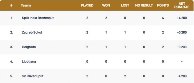 Zagreb Sokol and Belgrade are placed second and third in the standings. Both sides have two points, with the former having a slightly better net run rate.