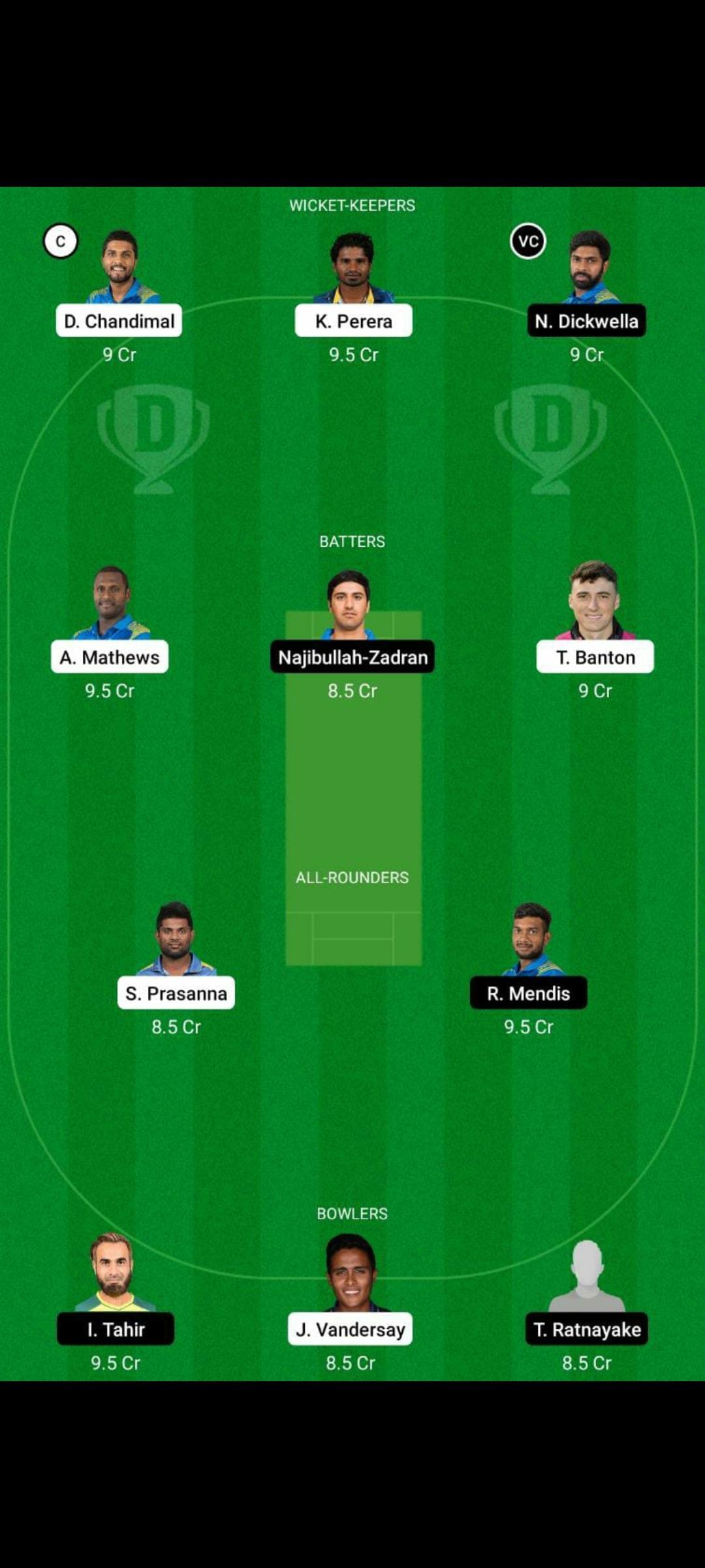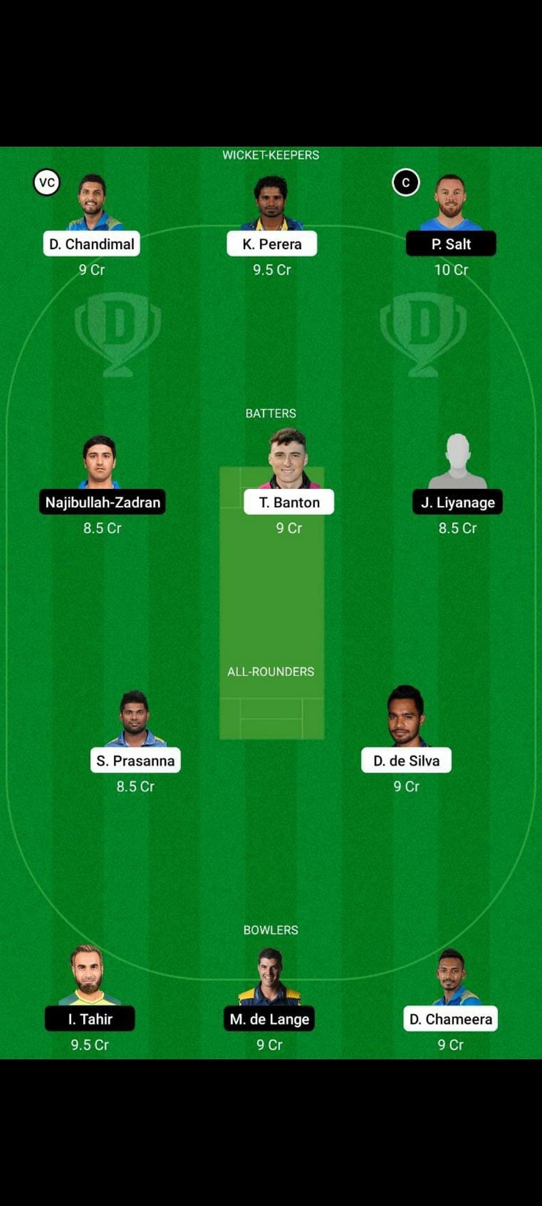 Fantasy Suggestion #1: D Chandimal, K Perera, P Salt, N Zadran, T Banton, J Liyanage, S Prasanna, D de Silva, I Tahir, M de Lange and D Chameera