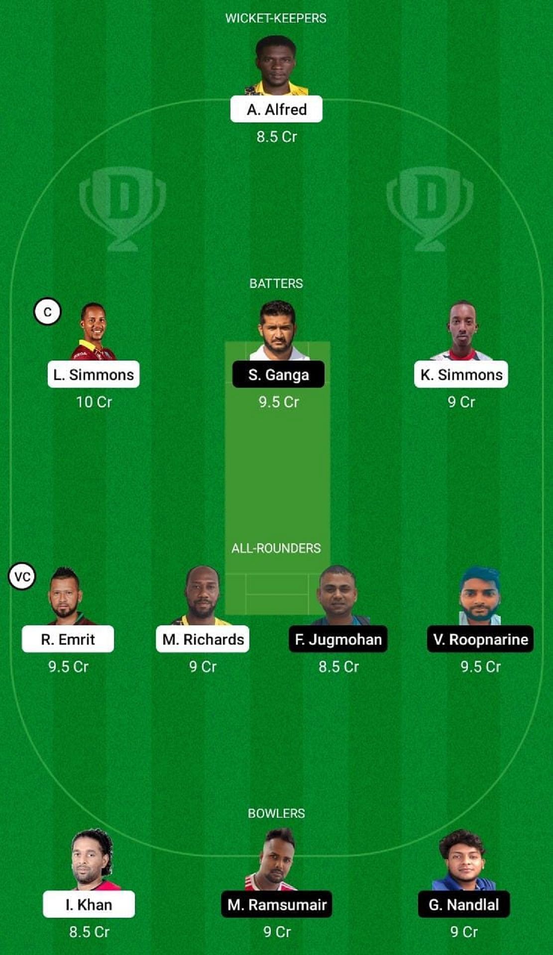 Fantasy Suggestion #1: A Alfred, K Simmons, L Simmons, S Ganga, F Jugmohan, M Richards, R Emrit, V Roopnarine, G Nandlal, I Khan, M Ramsumair