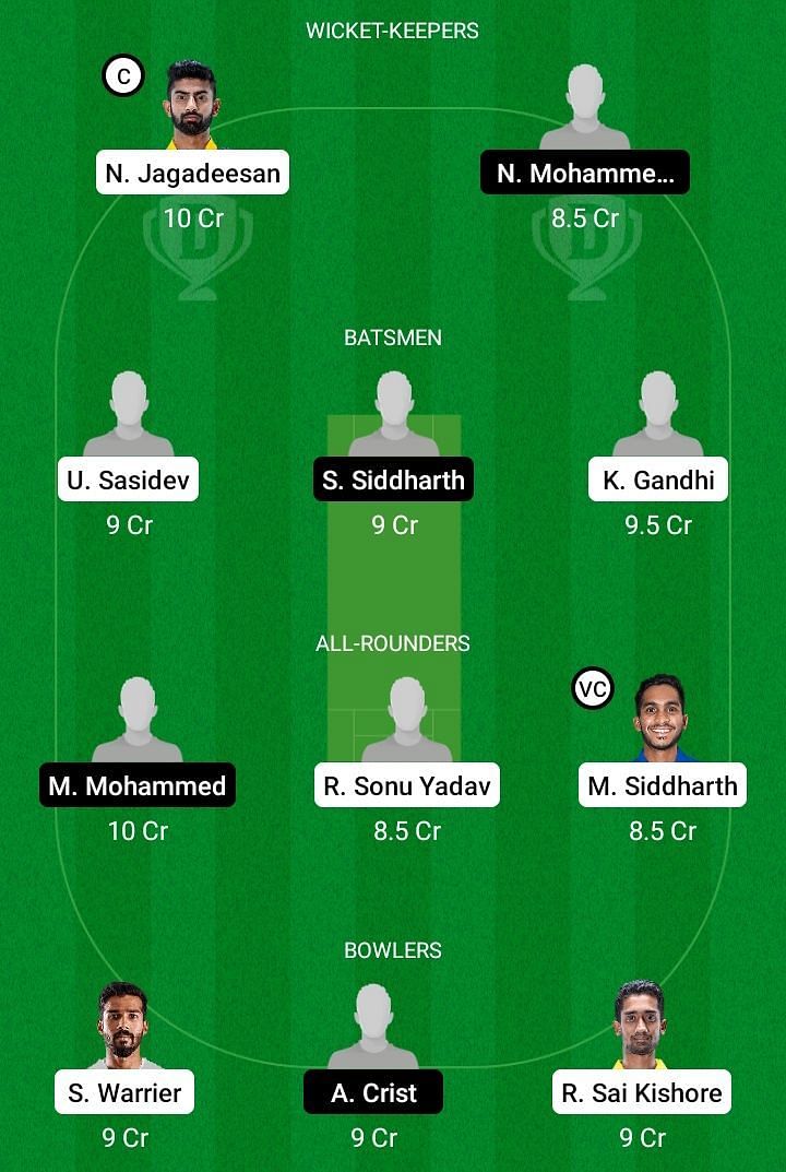 Fantasy Suggestion #2: Narayan Jagadeesan, Nilesh Subramanian, Kaushik Gandhi, S Siddharth, S Dinesh, Manimaran Siddharth, A Karippuswamy, M Mohammad, K Gowtham Thamarai, Ravisrinivasan Sai Kishore, Sandeep Warrier.